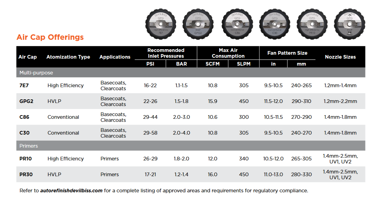 The high-efficiency and HVLP air caps have been developed to provide excellent atomization of a wide range of automotive refinish paints and coatings. The large array of fluid nozzles offers a wide range of flow rates allowing for rapid application rates for a multitude of coatings including clearcoats, basecoats, sealers, primers, enamels, synthetics and other common commercial paints.